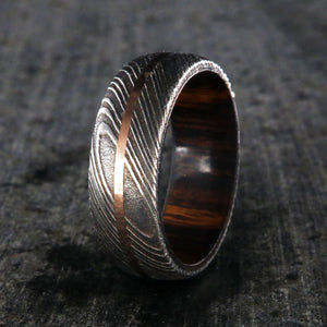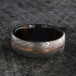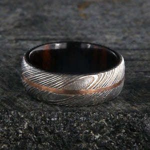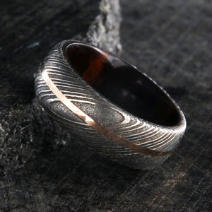 The rich depths of the Arizona ironwood sleeve in this Damascus steel wedding ring give dimension to the texture of the ring and glow of the rose gold inlay. This Damascus steel wedding ring is made with care and precision to ensure comfortable all-day wear and durability for the everyday activities of life.