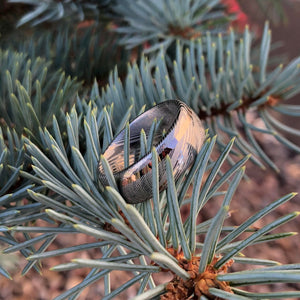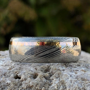 This is a USA-made comfort fit 8mm wide Damascus Steel with a rounded top profile, acid etches, and a 1-millimeter off-center 14k rose gold inlay. It is very comfortable to wear with a rounded comfort fit design. This ring is hand finished & designed by jewelry artisans who have a passion for unique jewelry & uncompromising quality.