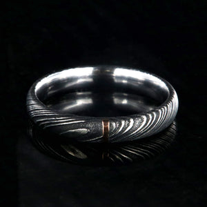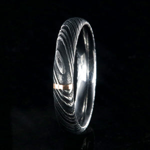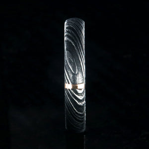 This delicate wedding band is a gorgeous rendition of the darkness of black Damascus steel paired with the minute and simple vertical gold inlay. This Damascus steel wedding ring is made with care and precision to ensure comfortable all-day wear and durability for the everyday activities of life.