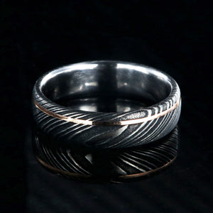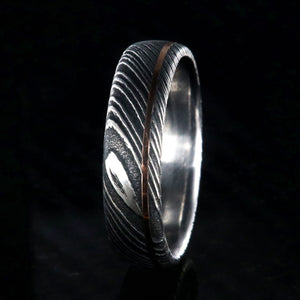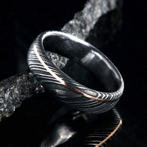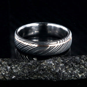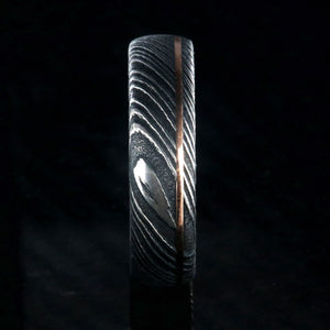 Adorned with a thin inlay of rose gold, this Damascus steel wedding band is a delicate balance of strength and grace. This Damascus steel wedding ring is made with care and precision to ensure comfortable all-day wear and durability for the everyday activities of life.