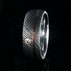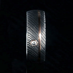 This Damascus steel ring represents high class with its two-tone texture with a rose gold inlay and delicately set diamond. This Damascus steel wedding ring is made with care and precision to ensure comfortable all-day wear and durability for the everyday activities of life.