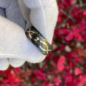 This is a USA made comfort fit 8mm wide Damascus Steel ring with a rounded top profile, acid etches, and a stunning infinity design inlaid with solid 14k yellow gold. It is very comfortable to wear with a rounded comfort fit design. This ring is hand finished & designed by jewelry artisans who have a passion for unique jewelry & uncompromising quality.