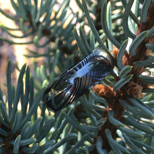 This is a USA-made comfort fit 8mm wide Damascus Steel with a round profile, acid etches, two-millimeter off-center 14k White Gold inlay, and a green box elder burl sleeve. It is very comfortable to wear with a rounded comfort fit design and a polished inside. This ring is hand finished & designed by jewelry artisans who have a passion for unique jewelry & uncompromising quality.