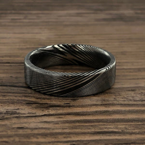 This handmade Damascus steel ring is 6mm wide with a flat profile that highlights the unique pattern of the metal and features a premium comfort fit (slightly convex on the inner band). Made with dense-twist damasteel from Söderfors, Sweden, where the steel industry began in 1676. Damasteel takes the traditional forging process of damascus steel to the next level by using powder metallurgical steel manufacturing. This process gives it superior corrosion resistance and strength to handle your day to day wear and tear.