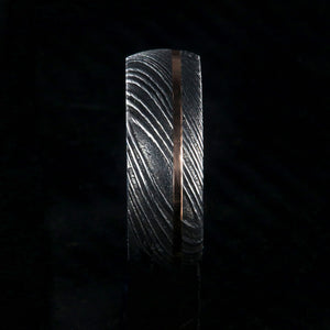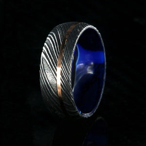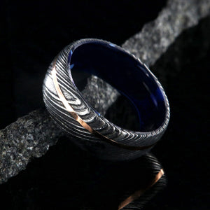 The cool depths of the dark blue acrylic sleeve in this men's Damascus steel ring creates the perfect backdrop to let the rose gold inlay shine. This Damascus steel wedding ring is made with care and precision to ensure comfortable all-day wear and durability for the everyday activities of life.