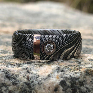 This is a USA-made 8mm wide Damascus Steel ring that sports a two-millimeter rose gold inlay and sparkling genuine diamond. It is very comfortable to wear with a rounded comfort fit design. This ring is hand-finished by jewelry artisans who have a passion for unique jewelry & uncompromising quality.