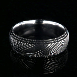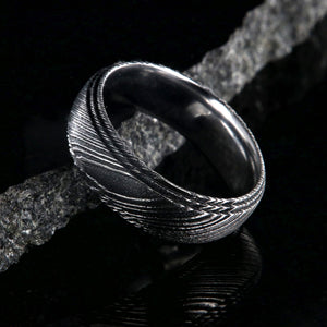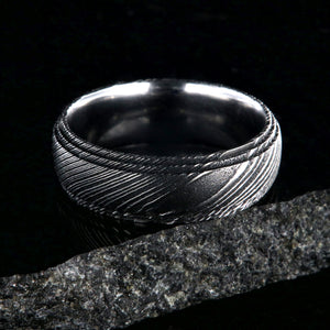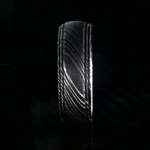 The simplicity of this men's wedding ring is what makes it such a powerful piece. Made with nothing but Damascus steel, this black ring is set apart by the undemanding grooves cut on each side. This Damascus steel wedding ring is made with care and precision to ensure comfortable all-day wear and durability for the everyday activities of life.