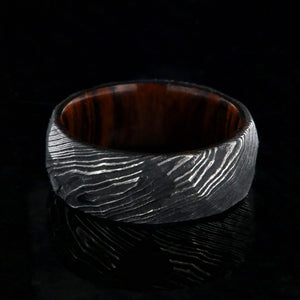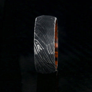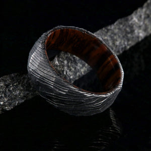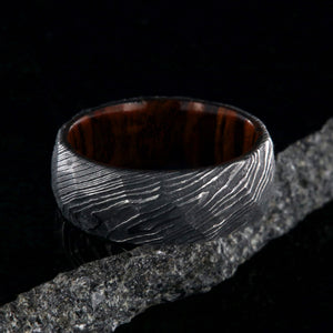 Rugged meets elegant in this men's Damascus steel wedding band with a smooth Arizona ironwood sleeve and the large texture of a hammered band. This Damascus steel wedding ring is made with care and precision to ensure comfortable all-day wear and durability for the everyday activities of life.