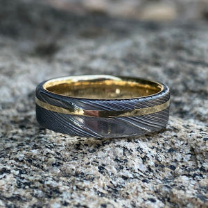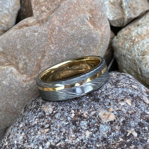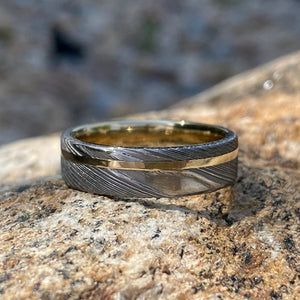 This is a USA-made comfort fit 6mm wide Damascus Steel Ring with a flat-top profile, acid etches, 1 millimeter off-center 14k yellow gold inlay, and a 14k yellow gold inside the sleeve. It is very comfortable to wear with a rounded comfort fit design. This ring is hand finished & designed by jewelry artisans who have a passion for unique jewelry & uncompromising quality.