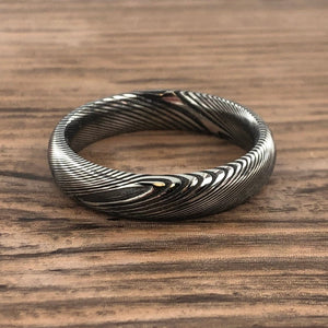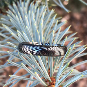This handmade Damascus steel ring is 5mm wide with a flat profile that highlights the unique pattern of the metal and features a premium comfort fit (slightly convex on the inner band). Made with dense-twist damasteel from Söderfors, Sweden, where the steel industry began in 1676. Damasteel takes the traditional forging process of damascus steel to the next level by using powder metallurgical steel manufacturing. This process gives it superior corrosion resistance and strength to handle your day to day wear and tear.