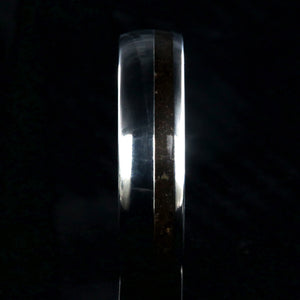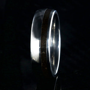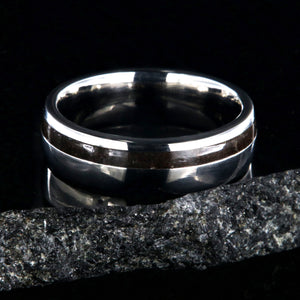 The smooth finish of this titanium wedding band surrounding the dark dinosaur bone inlay of this ring mirror the uncovering of the bones of the dinosaurs. Artisan jewelers made this ring with care and precision to ensure comfortable all-day wear and durability for the everyday activities of life.