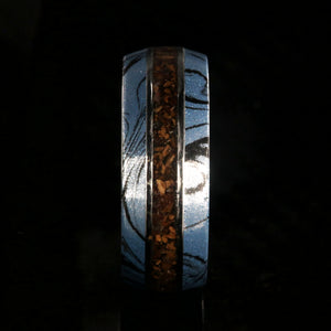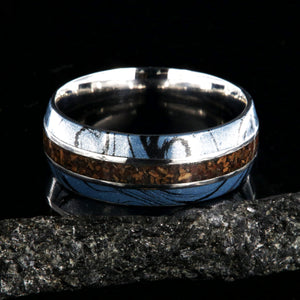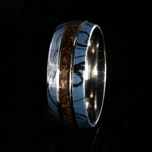 A unique mash up of earth-like colors in this cobaltium mokume and dinosaur bone ring for men highlight the unique and natural beauty of the world. Artisan jewelers made this ring with care and precision to ensure comfortable all-day wear and durability for the everyday activities of life.