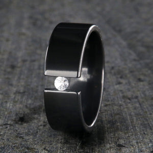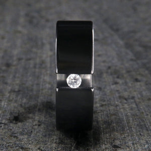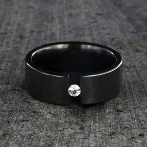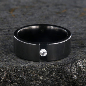 This beautiful 8mm tension set black zirconium band features a gorgeous 3mm stone. Our rings are made by only the best jewelry artisans and each ring is individually finished by hand. This ring has a comfort fit band to ensure that it will rest comfortably on your finger throughout the day. Each and every ring is custom made per order in the United States. Each ring is made uniquely to suit your lifestyle and has a quality that you can not match.