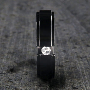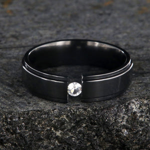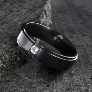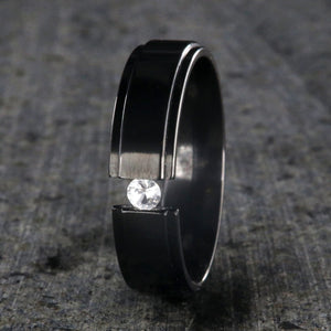 This beautiful 6mm tension set black zirconium band features a gorgeous 3 mm gem. Our rings are made by only the best jewelry artisans and each ring is individually finished by hand. Black Zirconium rings start out silver and then are subjected to extreme heat which then blackens the metal and makes them incredibly strong and scratch-resistant. This ring has a comfort fit band to ensure that it will rest comfortably on your finger throughout the day. Each and every ring is custom made per order in the United States. This ring also features a high shine polish finish giving this ring a brilliant shine. Each ring is made uniquely to suit your lifestyle and has a quality that you can not match.