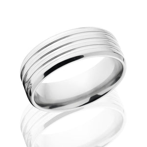 This is a USA-made comfort fit 8mm Cobalt Chrome band with beveled edges and three grooves down the center. The cobalt ring features a premium polished finish. This spectacular Cobalt wedding band is hand finished and is hypoallergenic. Cobalt is scratch-resistant, will not shatter or break like tungsten. This ring's quality is unmatched! Cobalt is the perfect wedding band material.