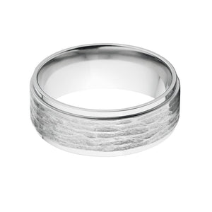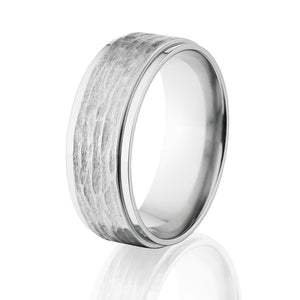 This is a USA-made comfort fit 8mm Cobalt Chrome band with a raised center. This amazing cobalt ring features two different finishes. The lower edges feature a high polish finish and a Horizontal Treebark finish is contrasted on the raised center. This spectacular Cobalt wedding band is finished by hand and is hypoallergenic. The Cobalt ring's quality is unmatched and a Cobalt ring makes a great wedding band or everyday band as it is scratch-resistant, will not shatter or break, is similar in color to white gold and platinum.