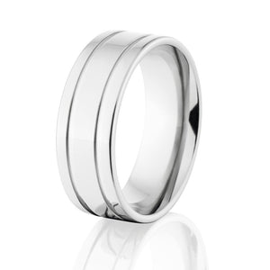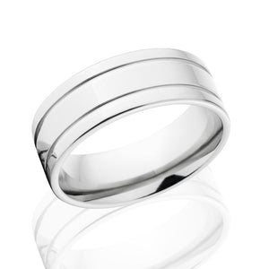 This is a comfort fit 8 mm band that is custom made to order by hand with Cobalt! This ring features a flat profile with 2 grooves and a Polished finish giving the ring the perfect finishing touch! This ring's quality is unmatched! Cobalt combines the unmatched shine of Platinum with the hardness and lightweight characteristics of Titanium. If you need a durable yet elegant ring this is for you!