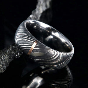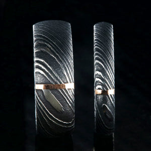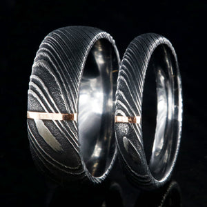 This matching wedding band set is a gorgeous rendition of the darkness of black Damascus steel paired with the minute and simple vertical gold inlay. This Damascus steel wedding ring is made with care and precision to ensure comfortable all-day wear and durability for the everyday activities of life.