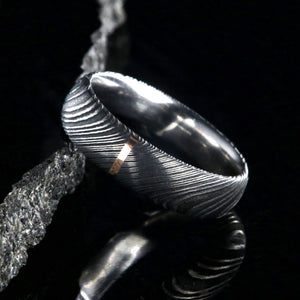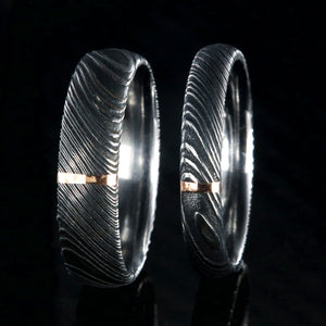 This matching wedding band set is a gorgeous rendition of the darkness of black Damascus steel paired with the minute and simple vertical gold inlay. This Damascus steel wedding ring is made with care and precision to ensure comfortable all-day wear and durability for the everyday activities of life.
