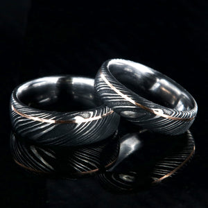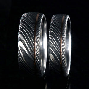 Adorned with a thin inlay of rose gold, this Damascus steel wedding band set is a delicate balance of strength and grace. These Damascus steel wedding rings are made with care and precision to ensure comfortable all-day wear and durability for the everyday activities of life.