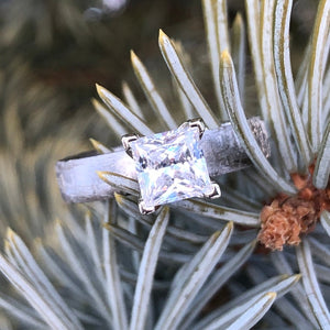 Glitter and gleam are the defining characteristics of this women's meteorite engagement ring. This meteorite is the perfect backdrop for the shine of a moissanite stone. Cut and shaped in our shop, this handcrafted ring is made with care by artisan jewelers to ensure comfortable all-day wear and durability for the everyday activities of life.