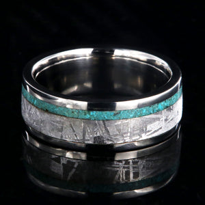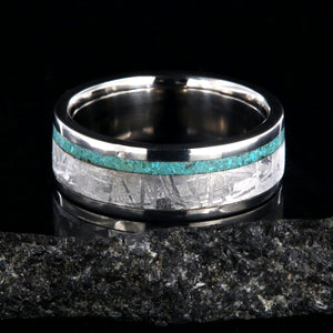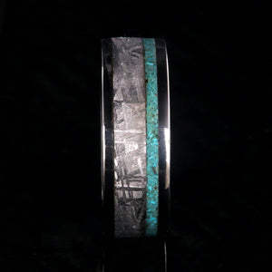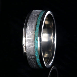 The gentle pinstripe of turquoise in this women's wedding band beautifully offset the wide band of meteorite. Cut and shaped in our shop, this handcrafted ring is made with care by artisan jewelers to ensure comfortable all-day wear and durability for the everyday activities of life.