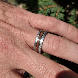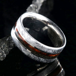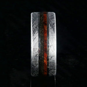 The neutral combination of meteorite and dark dinosaur bone allows the inlay of red box elder to snap with color in this men's wedding band. Cut and shaped in our shop, this handcrafted ring is made with care by artisan jewelers to ensure comfortable all-day wear and durability for the everyday activities of life.