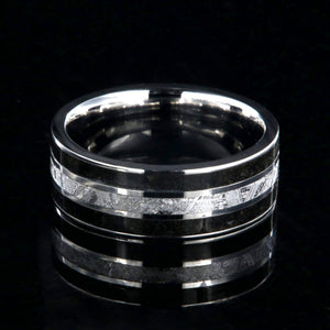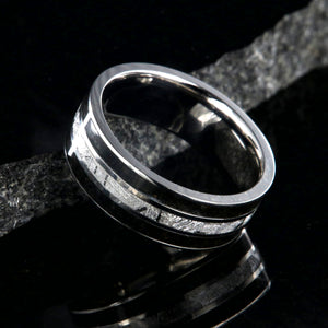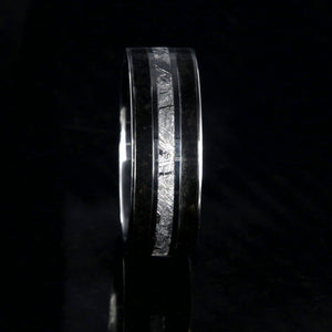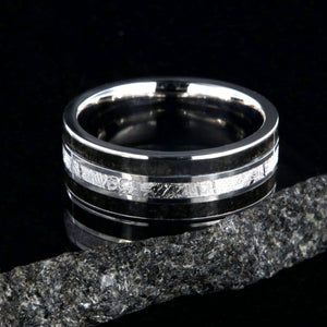 The king of the dinosaurs meets the heavens with this delicate combination of meteorite and tyrannosaurus rex fossil wedding band. Each of our rings are handcrafted by artisan jewelers to ensure quality and durability for the everyday activities of life.