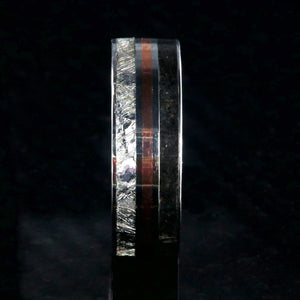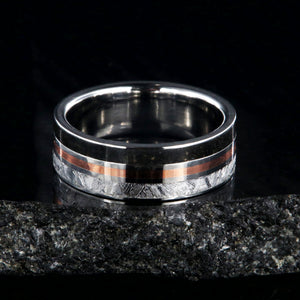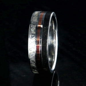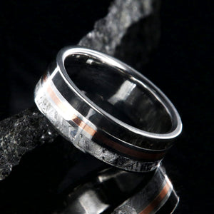 This wedding ring for men is a literal representation of when worlds collide. Genuine meteorite and dinosaur bone fossil and thin inlay of copper combine to make a stunning and unique wedding ring. Cut and shaped in our shop, this handcrafted ring is made with care by artisan jewelers to ensure comfortable all-day wear and durability for the everyday activities of life.