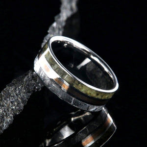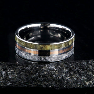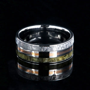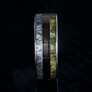 Gibeon meteorite paired with labradorite and rose gold create a rare combination of natural materials for this men's wedding ring. Cut and shaped in our shop, this ring is made with care by artisan jewelers to ensure comfortable all-day wear and durability for the everyday activities of life.