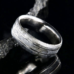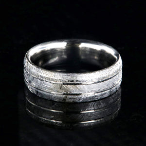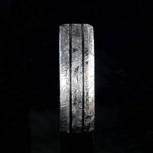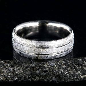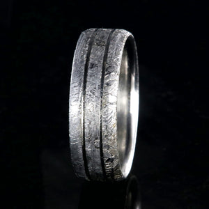 Thin cobalt inlays sit parallel to one another on this men's meteorite ring to add subtle texture to the unique pattern of the Gibeon meteorite. Cut and shaped in our shop, this handcrafted ring is made with care by artisan jewelers to ensure comfortable all-day wear and durability for the everyday activities of life.