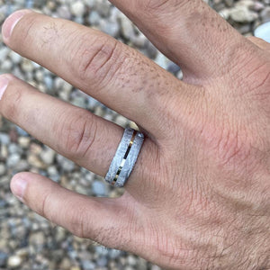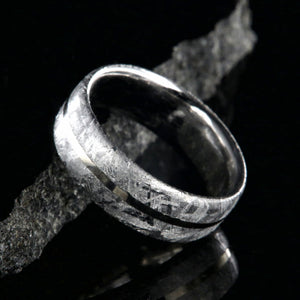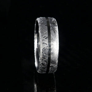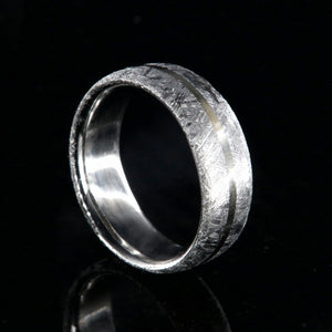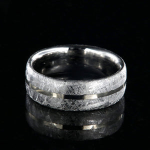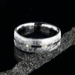 The similar, yet complimenting, colors of the meteorite and white gold in this men's wedding band are regal and elegant. Cut and shaped in our shop, this handcrafted ring is made with care by artisan jewelers to ensure comfortable all-day wear and durability for the everyday activities of life.