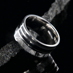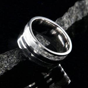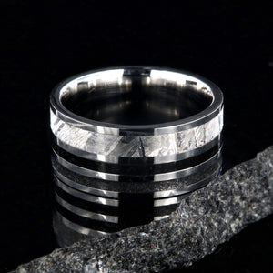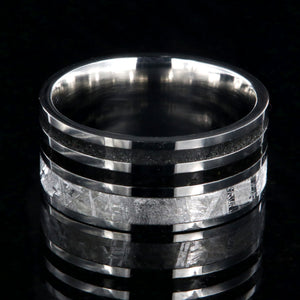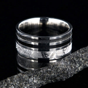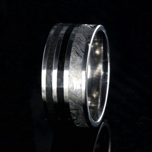 Layered to perfection this meteorite wedding ring shows off all the unique natural elements of the prehistoric by combining the remnants of an asteroid, heavenly stardust, and the dark bone of a dinosaur fossil. Cut and shaped in our shop, this handcrafted ring is made with care by artisan jewelers to ensure comfortable all-day wear and durability for the everyday activities of life.