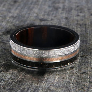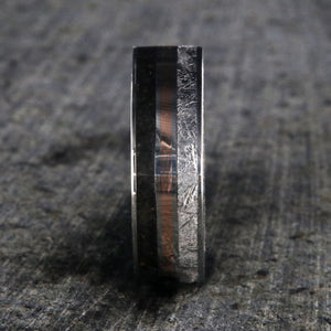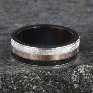 This wedding ring for men is a literal representation of when worlds collide. Genuine meteorite and dinosaur bone fossil and thin inlay of rose gold combine to make a stunning and unique wedding ring. The sleek Arizona ironwood sleeve adds class. Cut and shaped in our shop, this handcrafted ring is made with care by artisan jewelers to ensure comfortable all-day wear and durability for the everyday activities of life.