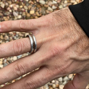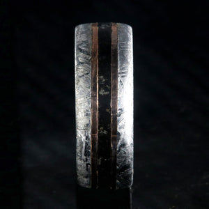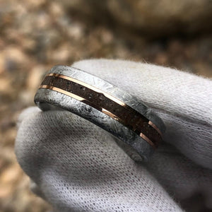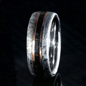 Risen from extinction is this extraordinary men's meteorite ring handcrafted from dinosaur bone and meteorite with beautiful inlays of gold. Artisan jewelers made this ring with care and precision to ensure comfortable all-day wear and durability for the everyday activities of life.
