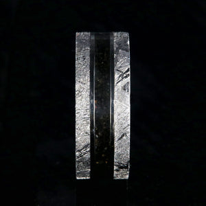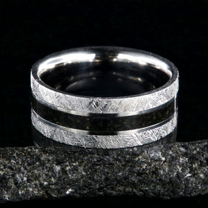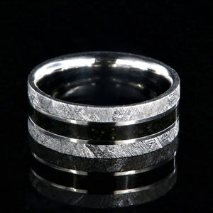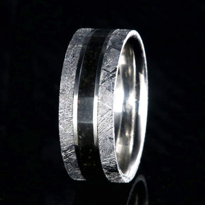 The greatest beasts on earth grace its surface once more in this stunning dinosaur bone and meteorite ring for men. Cut and shaped in our shop, this handcrafted ring is made with care by artisan jewelers to ensure comfortable all-day wear and durability for the everyday activities of life.