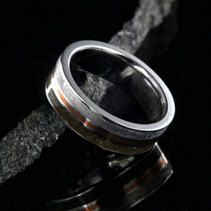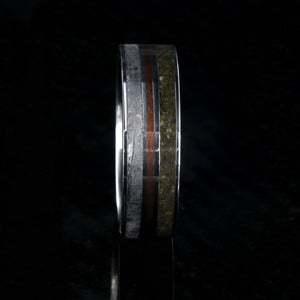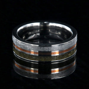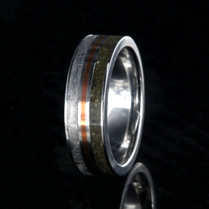 This wedding ring for men is a literal representation of when world's collide. Genuine meteorite and dinosaur bone fossil and thin inlay of copper combine to make a stunning and unique wedding ring. Cut and shaped in our shop, this handcrafted ring is made with care by artisan jewelers to ensure comfortable all-day wear and durability for the every day activities of life.