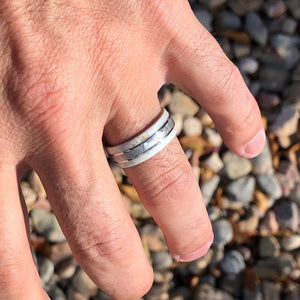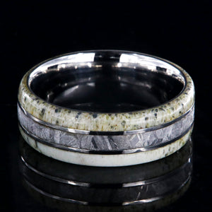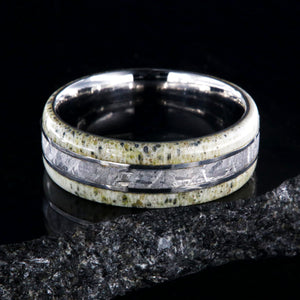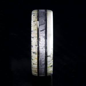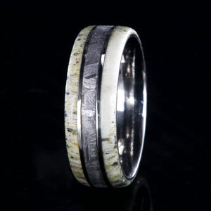 The quiet shades of white antler in this men's wedding band portray the regal and majestic nature of the king of the forest set against the delicate inlay of rare Gibeon meteorite. Cut and shaped in our shop, this handcrafted ring is made with care by artisan jewelers to ensure comfortable all-day wear and durability for the everyday activities of life.