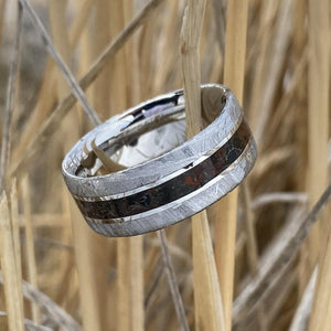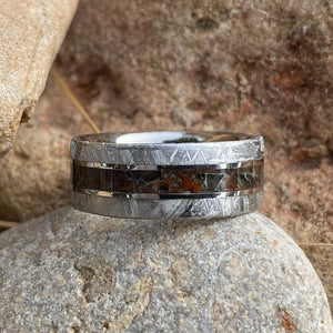These rings are truly out of this world. We have searched the globe for Gibeon meteorite to make these beautiful rings. This particular ring is made with meteorite, cobalt chrome, and dinosaur bone fossil and obsidian. It is 8mm wide with a flat profile and features our deluxe comfort fit.