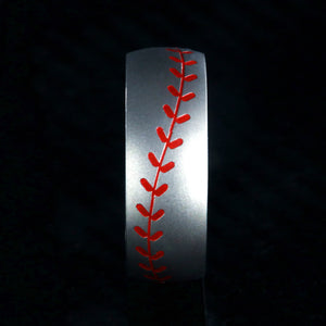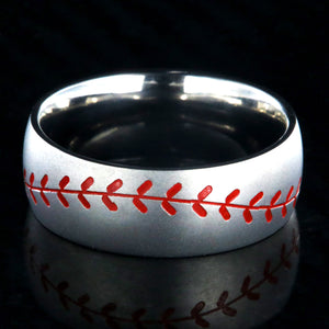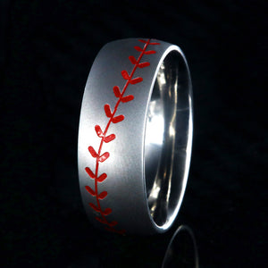 This USA made Baseball Stitch ring is custom made for you once ordered. The ring is made, hand-finished, and edged by skilled jewelry artisans. The comfort fits aerospace-grade titanium baseball ring is strong, durable, hypoallergenic, and a great ring for any Baseball lover! This baseball band measures 8mm wide has a domed profile and an inside comfort fit design. The Baseball red Stitch on the ring is etched around the entire band.