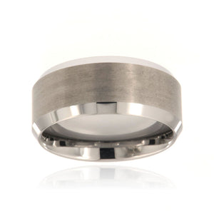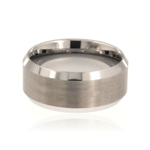 Heavy 10mm tungsten carbide ring with brushed finish center and high polished, beveled edges. This ring includes a premium comfort fit and FREE personalized inside engraving. It comes with a lifetime manufacturer's warranty and satisfaction guarantee.