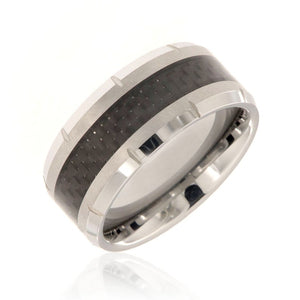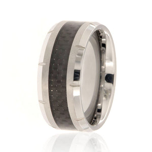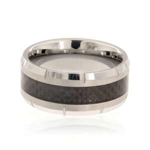 Stunning 10mm tungsten carbide ring with dual bevels and 4mm carbon fiber center inlay. This ring includes a premium comfort fit and FREE personalized inside engraving. It comes with a lifetime manufacturer's warranty and satisfaction guarantee.