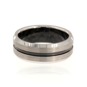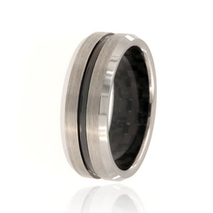 Modern 8mm tungsten carbide grey ring with a sleek center groove, black carbon fiber sleeve, brush finish, and high polished beveled edges. This ring includes a premium comfort fit and FREE personalized inside engraving. It comes with a lifetime manufacturer's warranty and satisfaction guarantee.