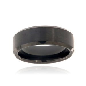 Stunning 8mm tungsten carbide ring with dual bevels and black finish. This ring includes a premium comfort fit and FREE personalized inside engraving. It comes with a lifetime manufacturer's warranty and satisfaction guarantee.