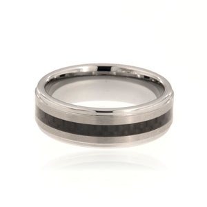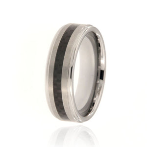 Stylish 7mm tungsten carbide ring with black carbon fiber inlay. Brush finish center and high polish step edge. This ring includes a premium comfort fit and FREE personalized inside engraving. It comes with a lifetime manufacturer's warranty and satisfaction guarantee.