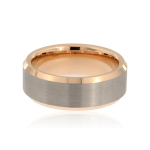 Stylish 8mm tungsten carbide two-tone ring with a brushed center band and high polished beveled edges. This ring includes a premium comfort fit and FREE personalized inside engraving. It comes with a lifetime manufacturer's warranty and satisfaction guarantee.