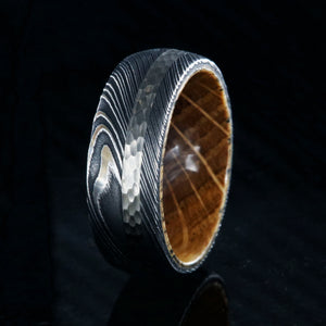 The dark hue of the Damascus steel gives any gold inlay of this ring a pop that is sure to stand out. The hammered texture of the inlay creates movement that highlights the flow of the Damascus steel. The warm glow of the whiskey sleeve compliments the contrasting hues of gold and Damascus steel giving this ring a rich look that won't be found elsewhere. Artisan jewelers in the USA handcraft this ring with a focus on high quality, accuracy, and creativity. This Damascus steel wedding ring is made with care and precision to ensure comfortable all-day wear and durability for the everyday activities of life.