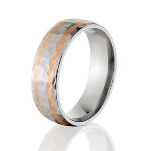 This comfort fit 7mm Titanium Ring is USA made with a Rounded Profile and features Two 1mm Copper Inlays. The ring is perfectly finished with a HammerBand Brush Finish. This ring is spectacularly unique!