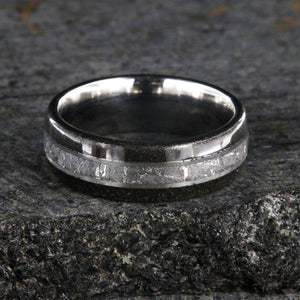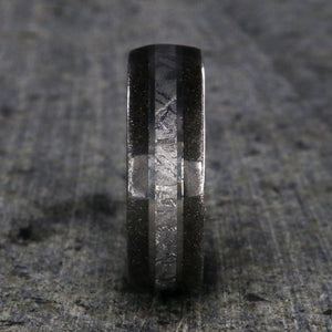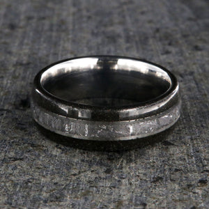 Bursting from the center is a beautiful inlay of meteorite encased by the dark hues of stardust in this men's wedding band. This stardust and meteorite ring is made with care and precision to ensure comfortable all-day wear and durability for the everyday activities of life.