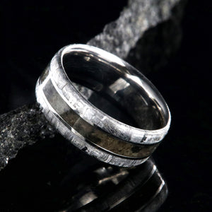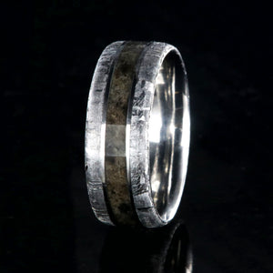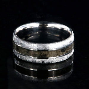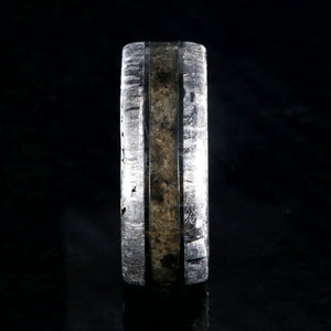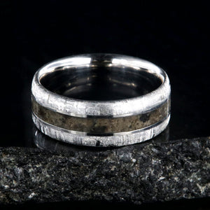 Intricate pieces of Gibeon meteorite line a center of authentic dinosaur bone to create a stunning men's meteorite and dinosaur bone ring. Cut and shaped in our shop, this handcrafted ring is made with care by artisan jewelers to ensure comfortable all-day wear and durability for the everyday activities of life.